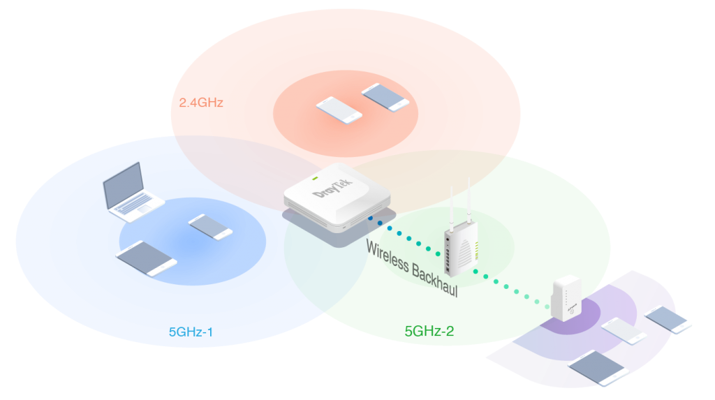 Với băng tần 5GHz bổ sung, VigorAP 1000C ở chế độ Mesh là lý tưởng để hình thành liên kết truyền dẫn không dây chuyên dụng. Các thiết bị không dây vẫn có thể kết nối với 2.4GHz và radio 5GHz khác, giữ cho cả hai băng tần ít bị nhiễu hơn và cải thiện trải nghiệm Wi-Fi cho tất cả các máy khách.